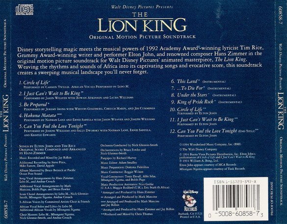 The original English-language motion picture soundtrack, released around the world during the summer of 1994 on CD, LP, MC, and DCC. Repackaged in 2003 with an additional remix of the lead single Can You Feel The Love Tonight, to promote the movie’s DVD release. Reissued again in 2006, to coincide with the Broadway musical adaptation. An expanded 2-disc set was released in 2014 to celebrate the film’s twentieth anniversary. Released on vinyl almost annually since.