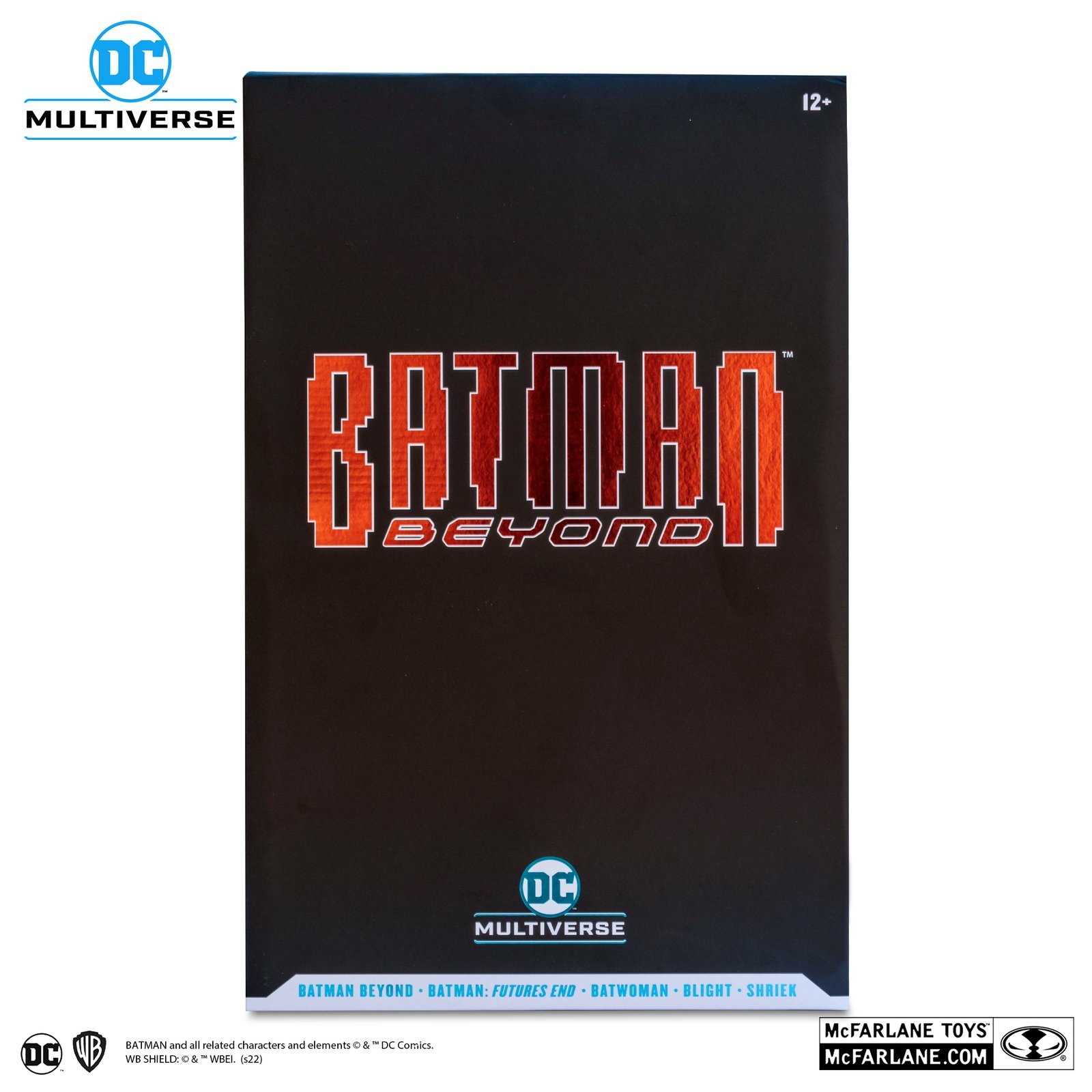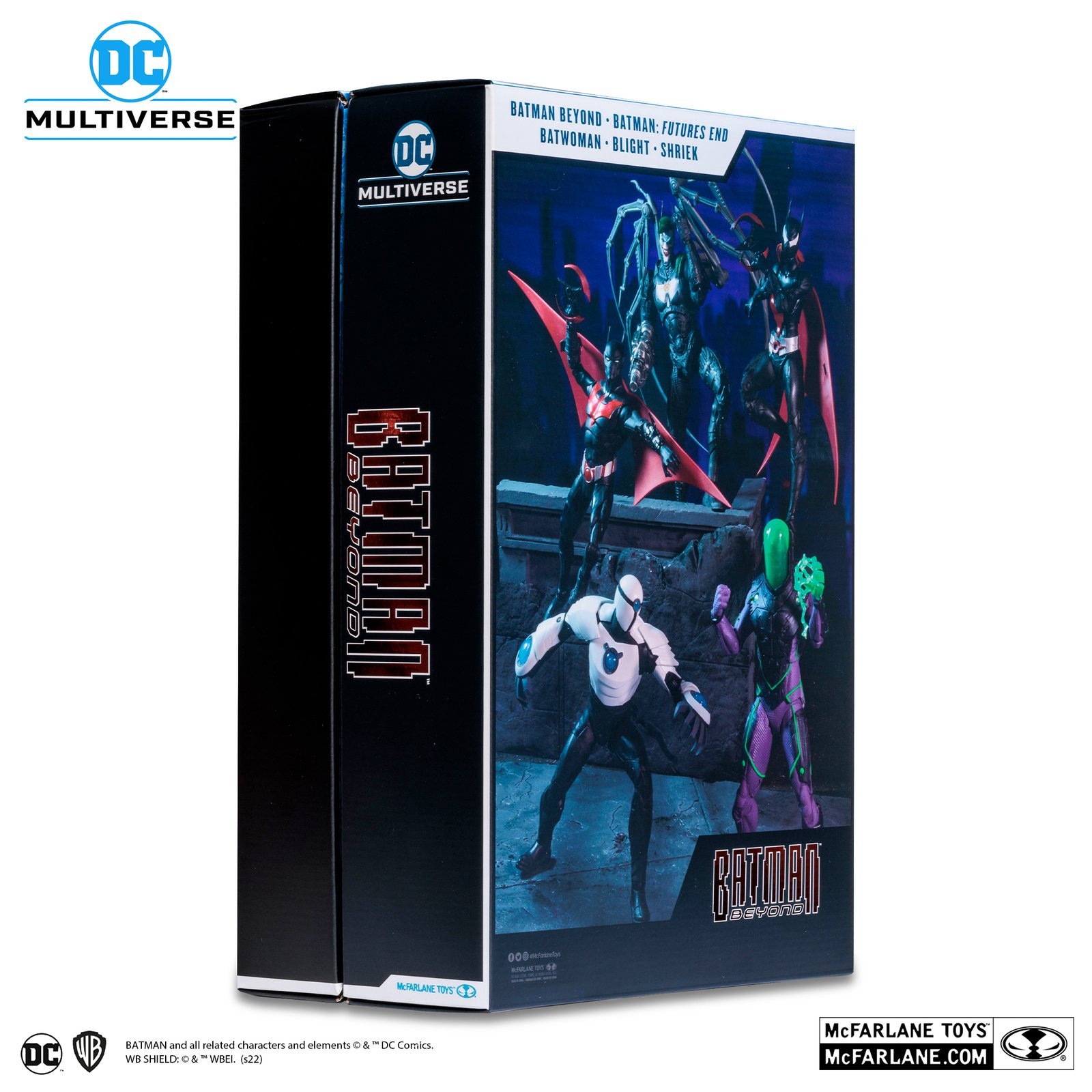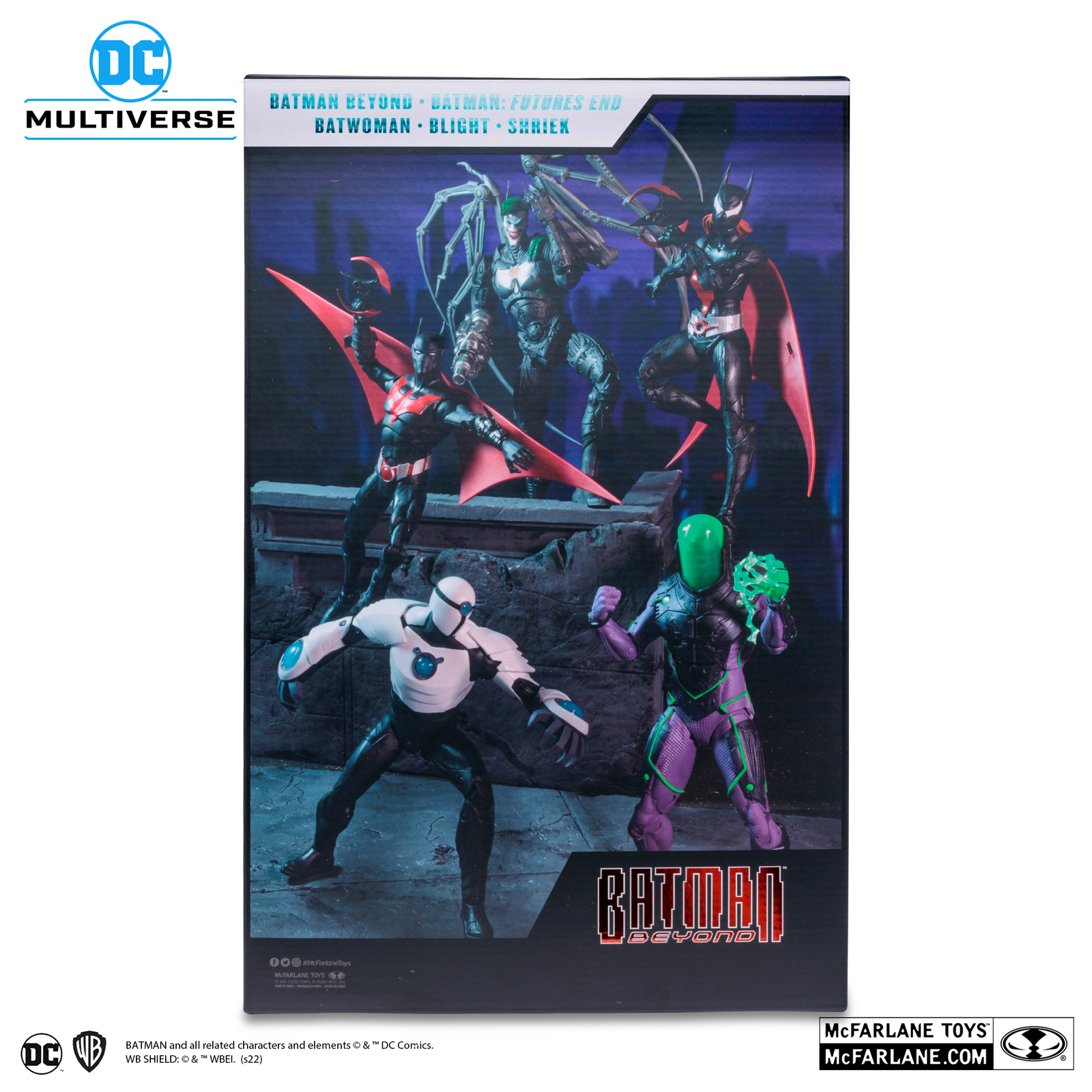 A deluxe collector’s pack that contains all 5 Batman Beyond Build-A figures; Batman Beyond, Batwoman Beyond, Blight, Shriek, and Batman: Futures End, complete with their art cards and accessories, in a foil window box packaging that folds open to display.