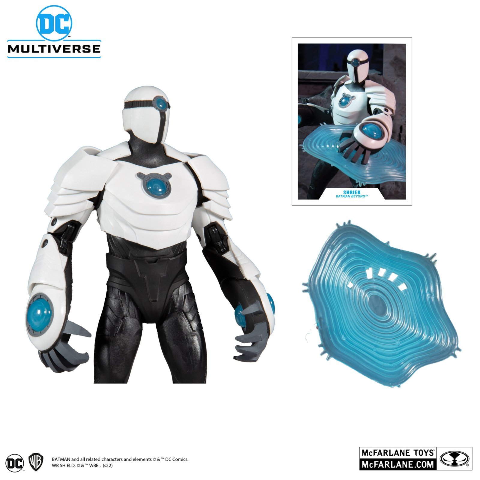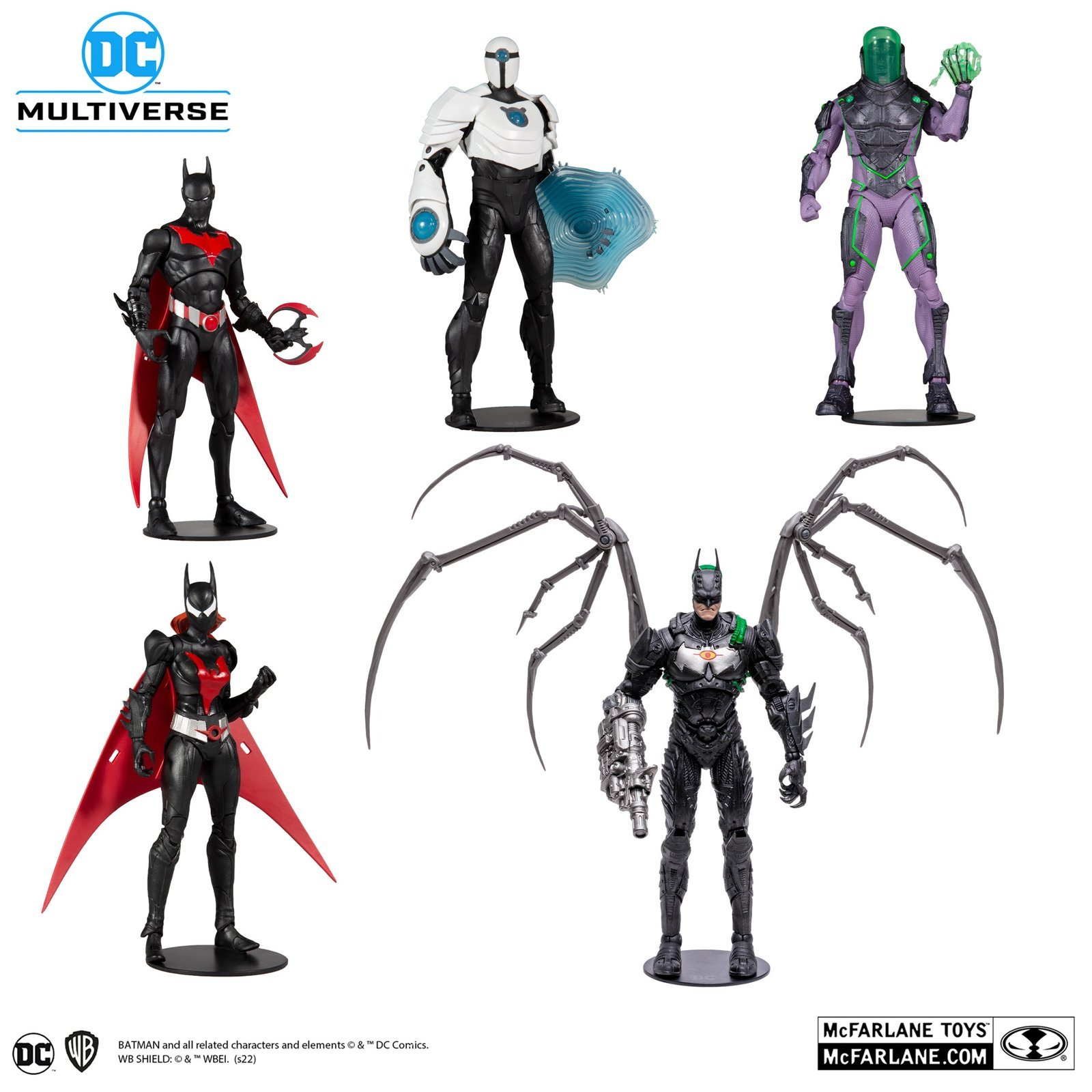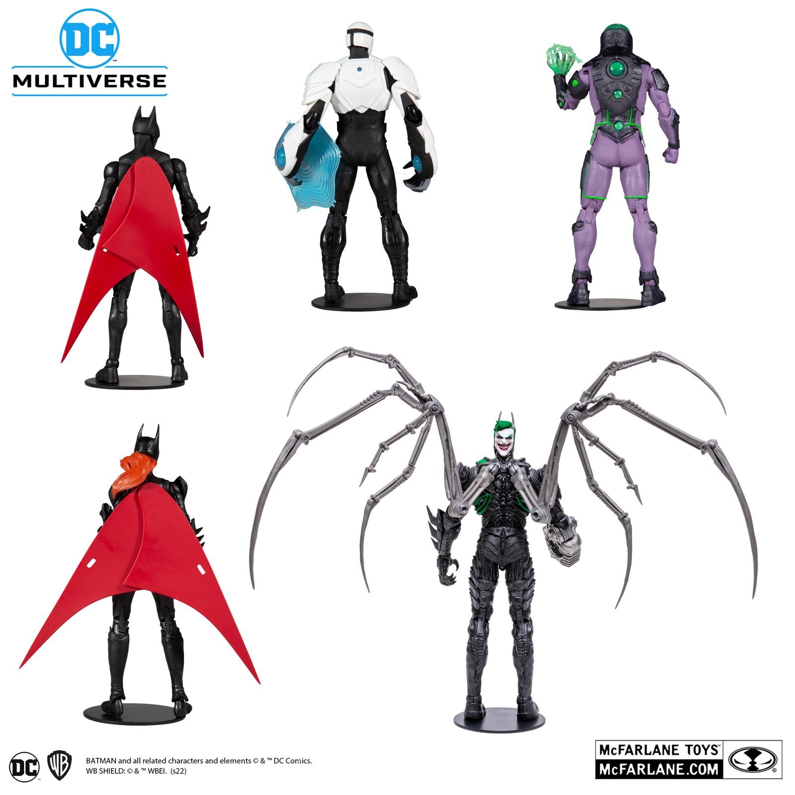 A deluxe collector’s pack that contains all 5 Batman Beyond Build-A figures; Batman Beyond, Batwoman Beyond, Blight, Shriek, and Batman: Futures End, complete with their art cards and accessories, in a foil window box packaging that folds open to display.