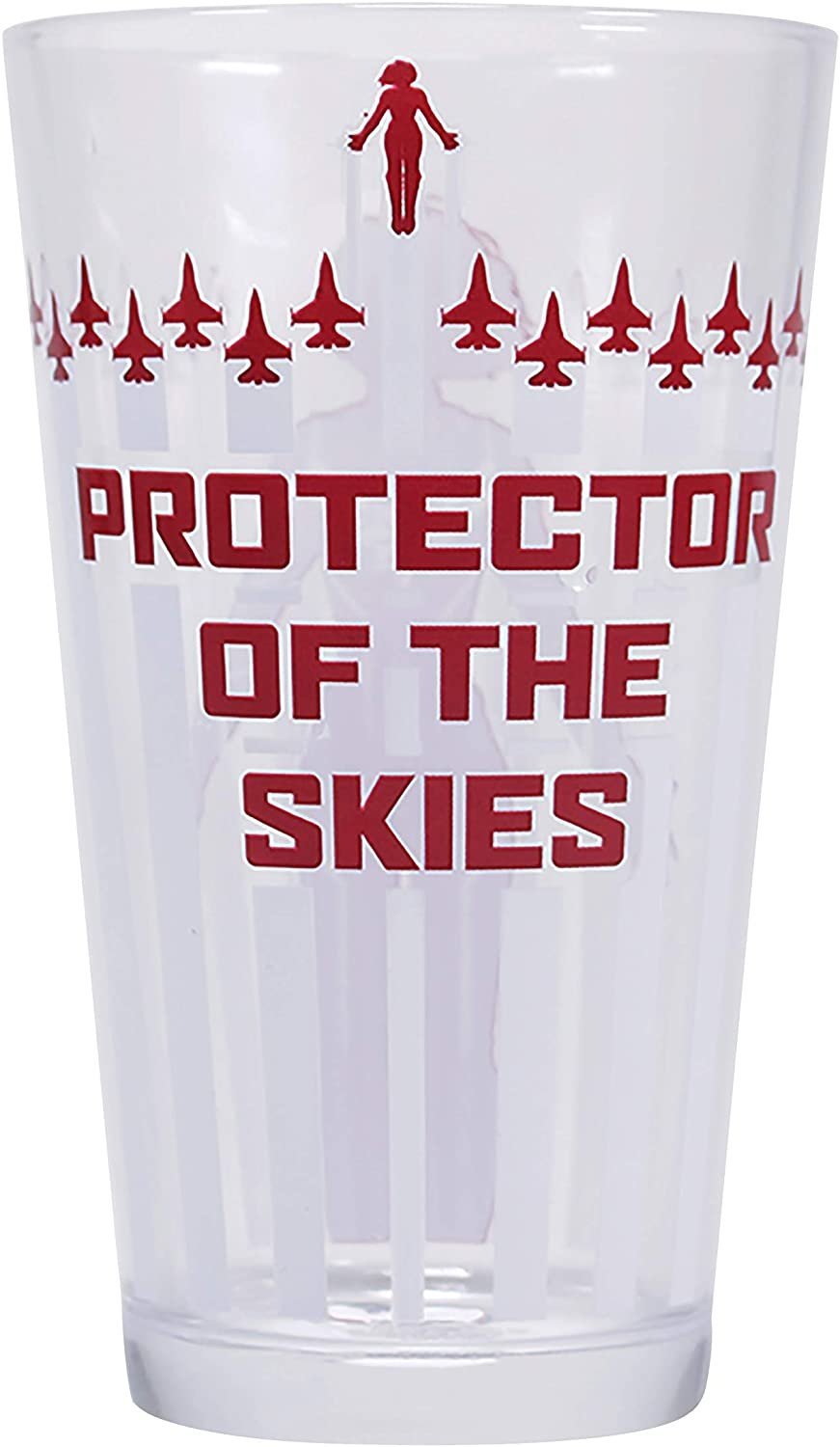 - Empty, the glass features the words “Protector of the sky” on one side and the silhouette of Captain Marvel on the other