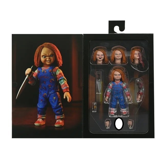 This Ultimate action figure depicts the murderous doll, inhabited by the soul of a serial killer, as seen in the all-new “coming of rage” TV series, CHUCKY. Including four interchangeable head sculpts, interchangeable hands, butcher knife, syringe bundle, and an interchangeable burnt arm. This figure stands 4″ tall with over 15 points of articulation.