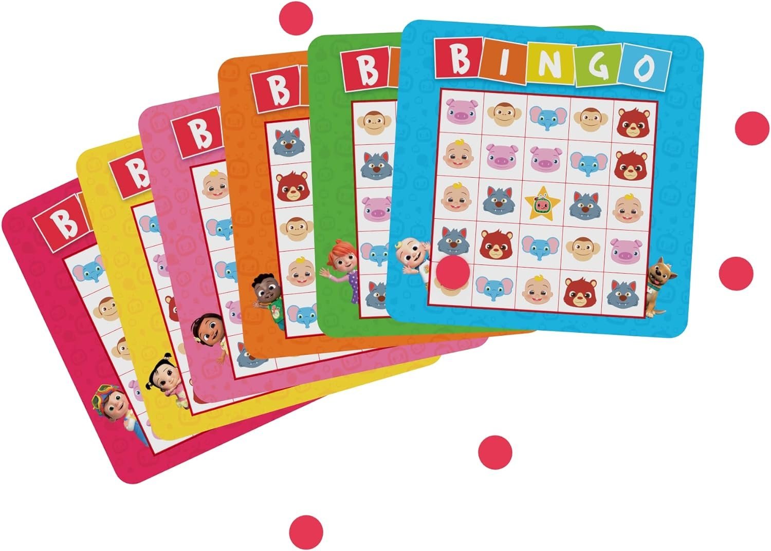 Enjoy this classic game with all your Cocomelon friends! Roll the oversized dice and mark your cards until you get a horizontal, vertical, or diagonal line. Don’t forget that free space! Roll a Wild Watermelon and place a token on any space in the corresponding letter’s column! The first player to get five squares in a row sings B-I-N-G-O to let everyone know they’ve won! Includes 6 Bingo Cards, 2 BIG Dice (1 with B, I, N, G, O, and Wild Space; 1 with Animals), 60 Tokens, and Complete Instructions. Recommended for 2-6 players, ages 4 and up.