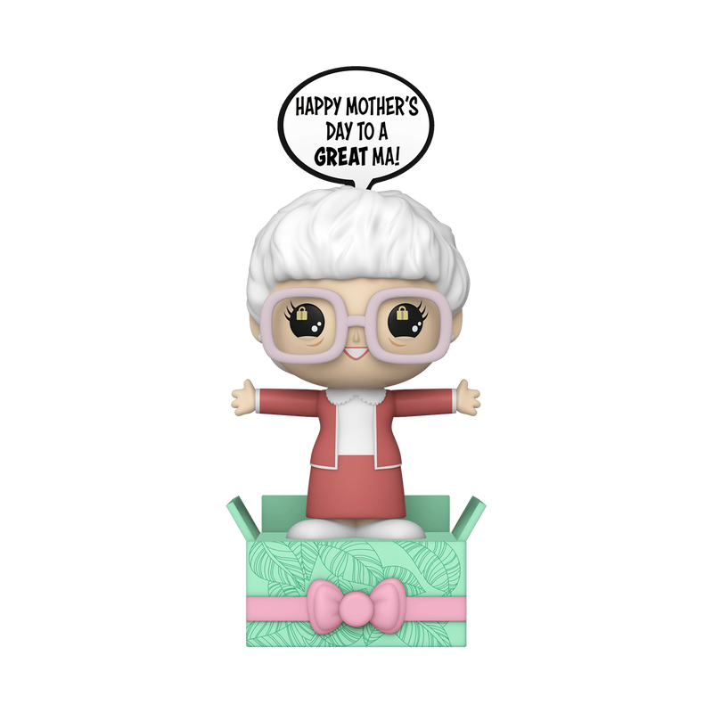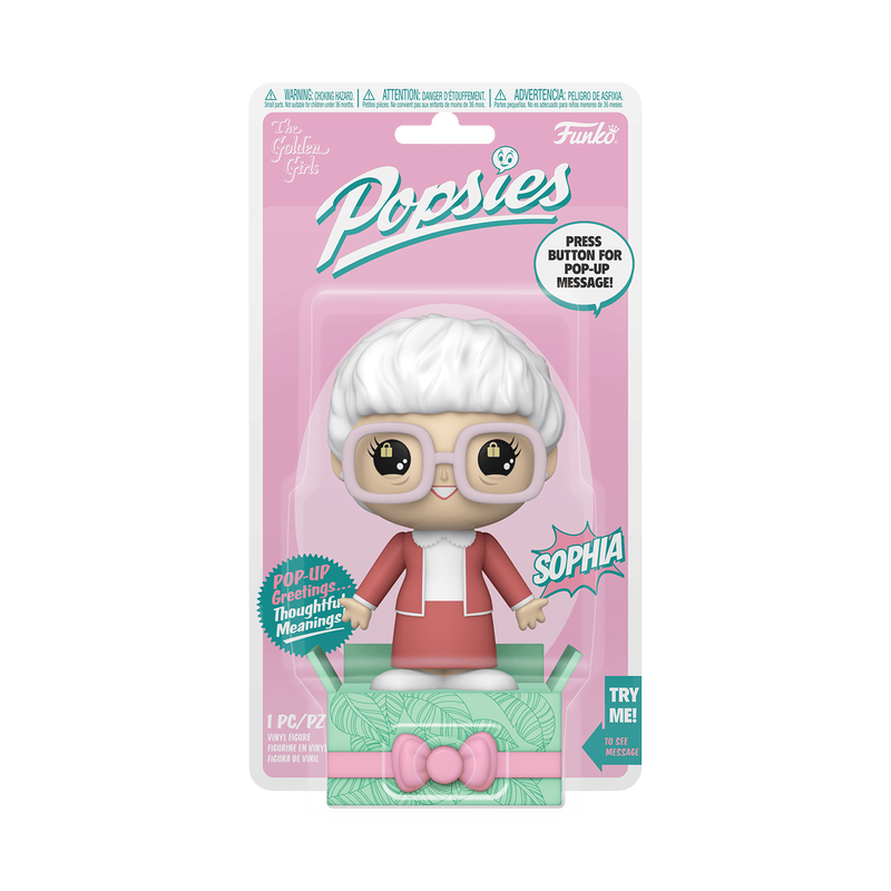 Surprise a friend or loved one with open arms and a pop-up greeting with Popsies, the new collectible greeting by Funko! Press the center of the bow and the special message appears above Sophia from The Golden Girls as she holds her arms out wide. You can even write who it’s from and for with a permanent marker on the present’s label. Share a sentiment and a smile with an awesome Golden Girls Sophia Popsies! Vinyl collectible greeting is approximately 4.75-inches tall.