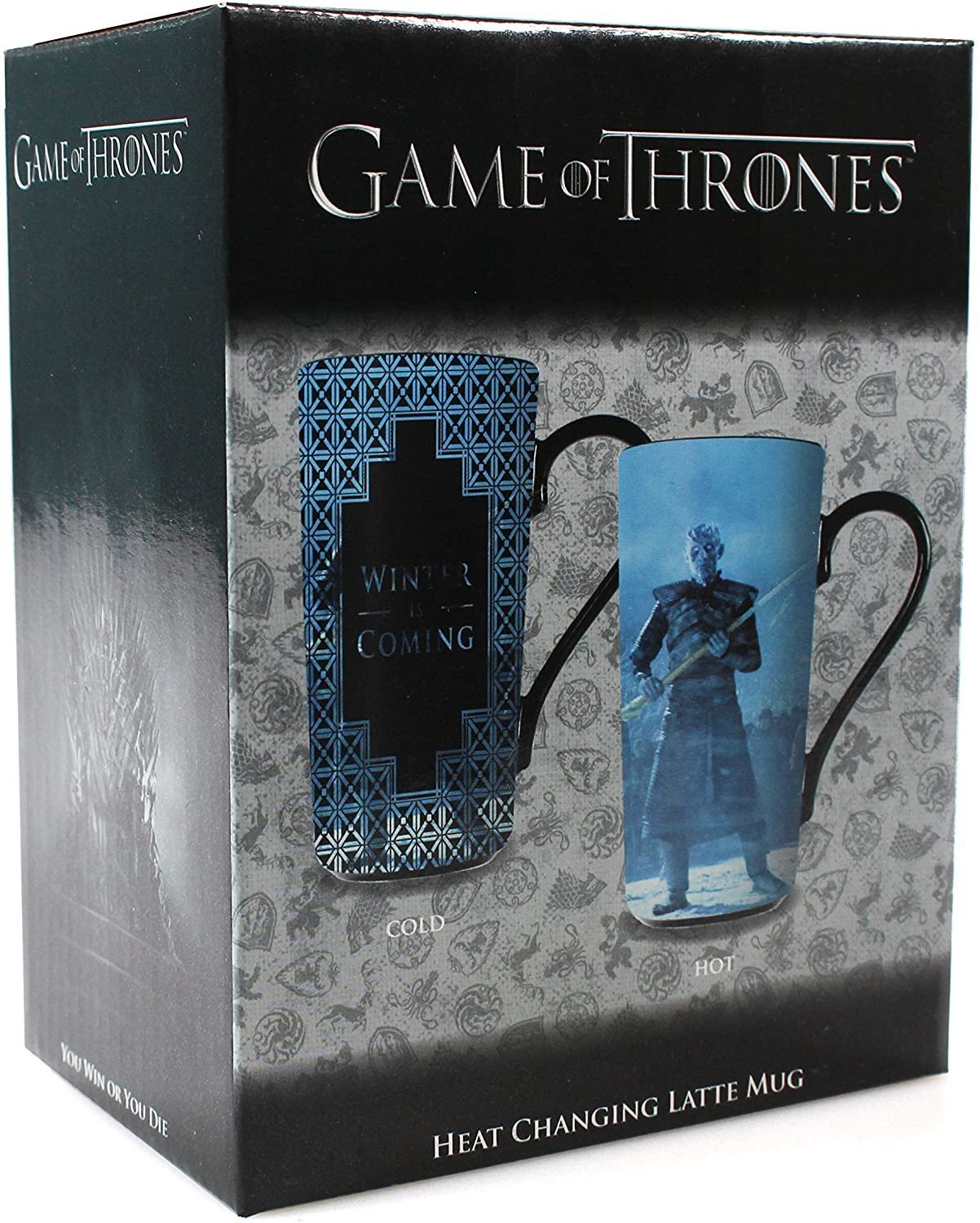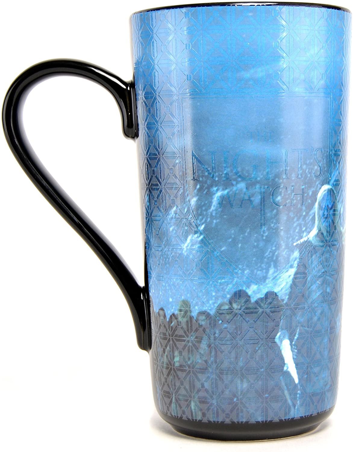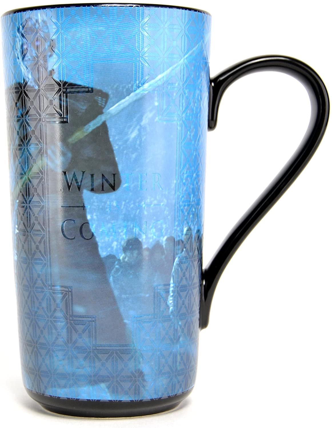 This Game of Thrones Heat Changing Latte Mugs commemorates one of the most devastating battles so far, the Massacre at Hardhome, where the Night’s Watch battled against the White Walkers. Cold, the Game of Thrones mug shows the Stark house words Winter is Coming on the front, which is a warning not only against the cold season but against the White Walkers. The back shows The Night’s Watch shield. When hot liquid is poured in, the Game of Thrones mug transforms to reveal the Night King, leader of the White Walkers, watching as the remaining wildings and members of the Night’s Watch evacuate by boat, surrounded by the thousands of wildlings that were killed and raised as wights. Once the drink is finished the Game of Thrones gift mug returns to its original state as it cools.