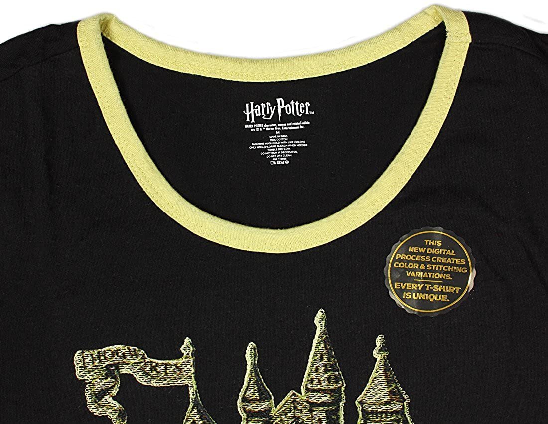 This officially licensed Harry Potter shirt has the newest in apparel embroidery technology! This shirt features a intricately and detailed Marauders Map Hogwarts School design and script. The new digital process creates color and stitching variations that give each shirt unique shading. Every shirt is slightly different!! The embroidery is top quality and we know you will love it!. The shirt also has yellow cuffs and neck for a 2-tone color. Made of 100% cotton.