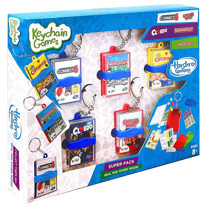Take your favourite Hasbro games on the go with this super pack of 5 mini keychain games.
