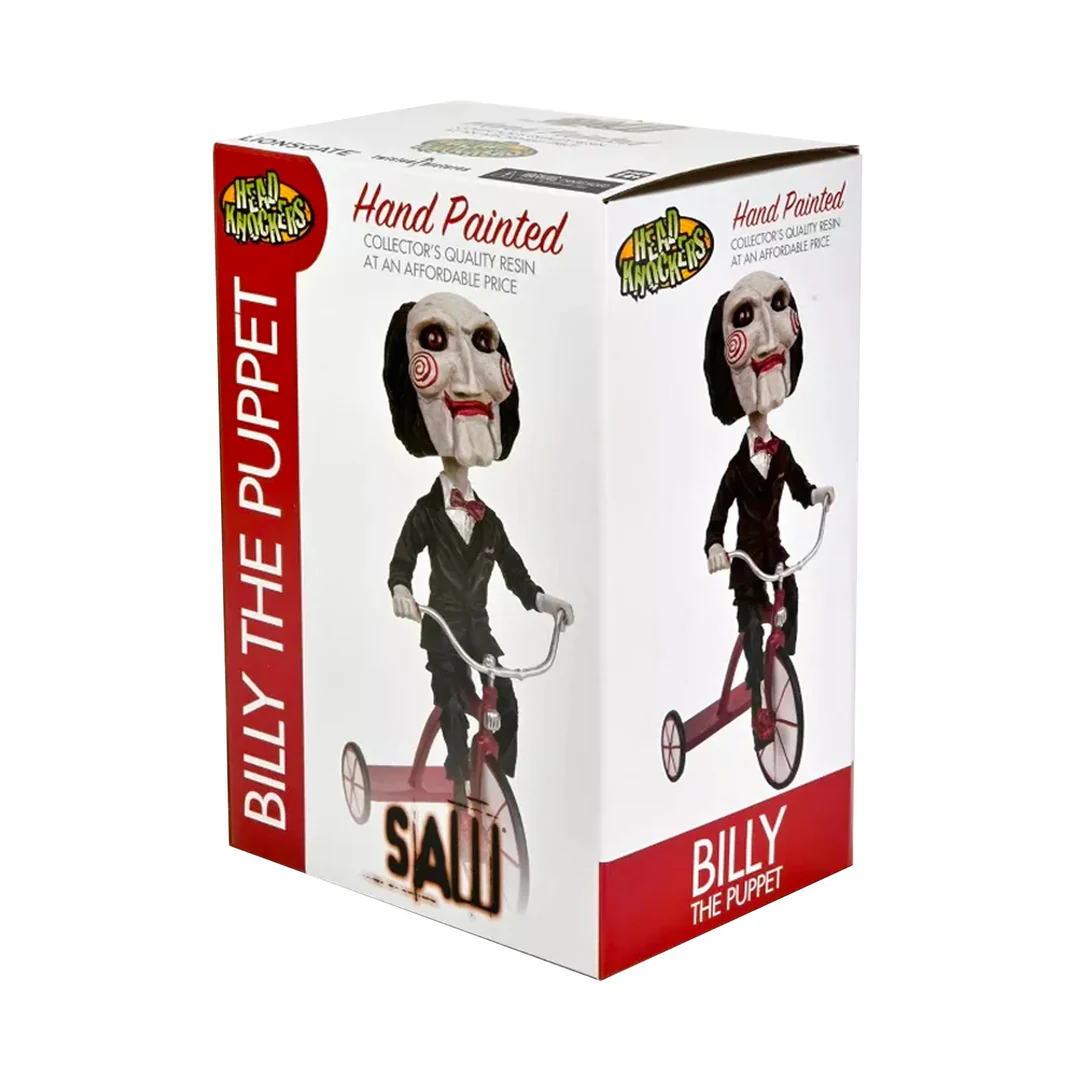 Billy is back! Returning to NECA’s popular Head Knockers line is the iconic puppet from Saw. The horror movie series uses this tricycling terror to great effect, but here his bobbling head makes him almost cute. Almost. Made of hand-painted resin, this Head Knocker is 8″ tall and comes in collectible matte-finish packaging with spot gloss.
