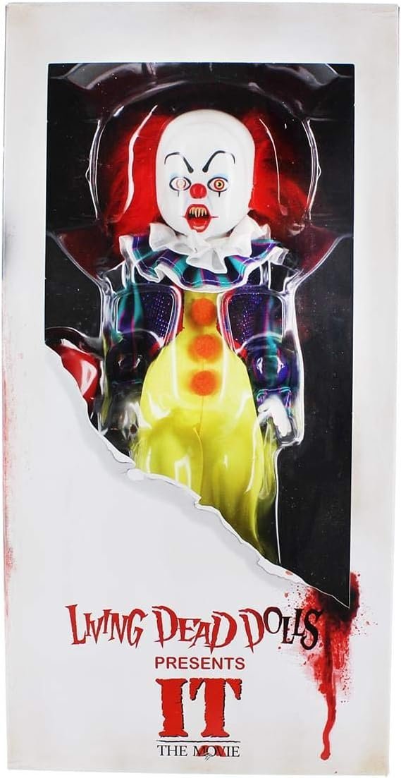 The Living Dead Dolls Presents IT 1990: Pennywise stands 10 inches tall, and has 5 points of articulation. He features real cloth clothing and comes with his red balloon. He is packaged in a custom die-cut window box perfect for display.