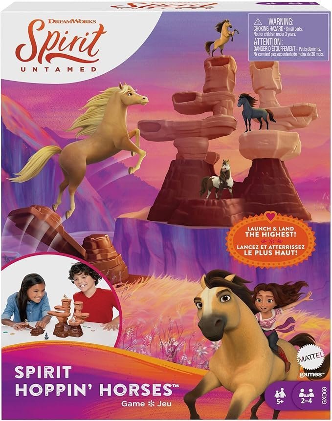 Spirit Hoppin’ Horses kids game transports children to the world of DreamWorks Spirit Untamed where they can bravely launch their horse onto the mountain to see who is king of the hill! Two to four players take turns with an easy-to-use launcher trying to land the wild horses and the Spirit horse on the highest spot of the mountain. Each round, the player in the highest numbered spot gets a coin. The first player to earn three coins wins the game! Spirit Hoppin’ Horses is a fun way to pass the time and makes a great toy for kids 5 years old and up who love horses and silly, fast-paced, active fun. Colors and decorations may vary.