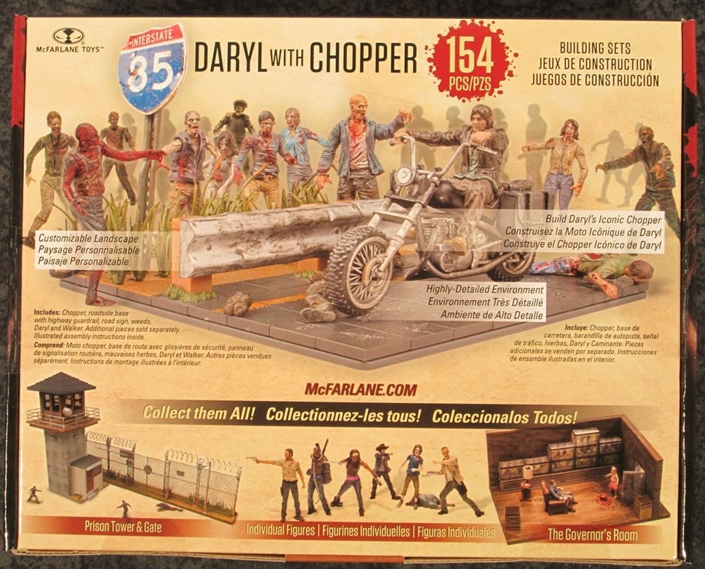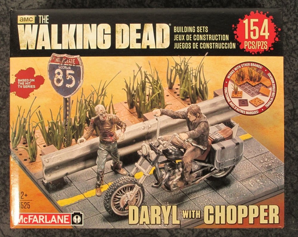 This is the new and hard to find Walking Dead Daryl Dixon w/ Chopper building set  by McFarlane. Based on television’s most watched drama, AMC’s The Walking Dead, McFarlane Toys is reinventing brick building toys. The Walking Dead Daryl with Chopper Mini-Figure Building Set is fun for fans of all ages! This level 3 set includes approximately 154 pieces to recreate scenes with Daryl Dixon riding his chopper past the walker herds! Base measures approximately 5-inches (13cm) x 5 inches, Chopper measures approximately 3 1/4-inches (8cm) long x 1 3/4-inches (4cm) tall, and Daryl measures approximately 1 3/4-inches (4cm) tall.