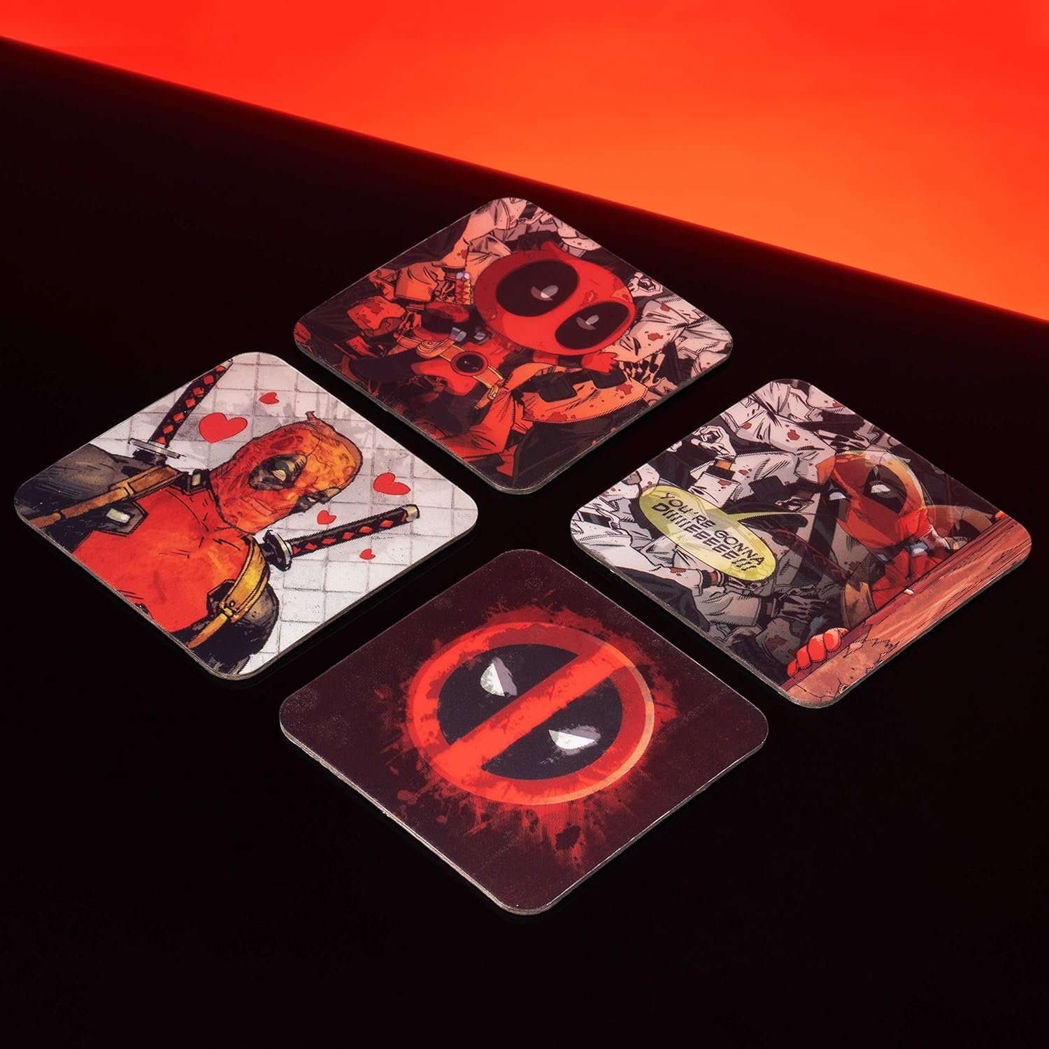 When he’s not saving lives (sort of), Dead pool can help you by saving your surfaces. These super-fun Dead pool Reveal Coasters not only protect your surfaces but they also look great. This pack of four reveal coasters have a number of comical designs featuring the wise-cracking anti-hero – the Merc with a Mouth. The set is a great gift for lovers of the Dead pool movies, as well as fans of the Marvel universe and comic books in general. Dead pool is a popular antihero who has recently caught the world’s attention thanks to two new, hugely loved movies. Dead pool and Dead pool 2 were released in 2016 and 2018 respectively and both were very well received as the humorous, more adult feel breathed new life into the superhero genre. Otherwise known as the ‘Merc with a Mouth’ and the ‘Regenerating Degenerate’, Dead pool is a mutant, wise-cracking superhero, who’s constantly making jokes. Originally featuring in Marvel Comics in the 90s, Dead pool has mutant abilities of quick physical healing and super strength, and with the success of the recent films, he’s quickly become a fan favourite from the Marvel Comics universe. The set of Dead pool Reveal Coasters is an officially licensed Dead pool product.