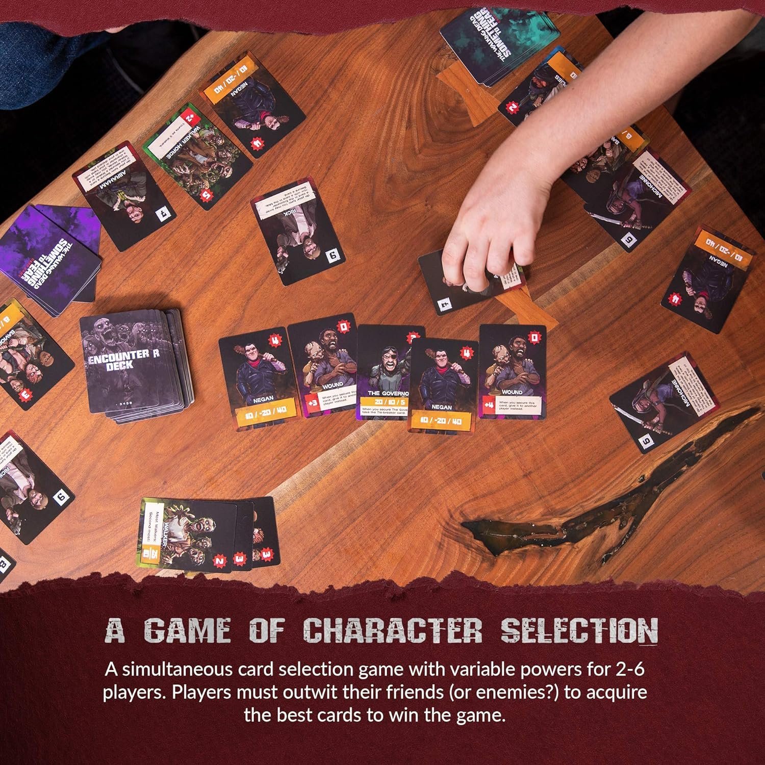The Walking Dead: Something to Fear is a simultaneous card selection game with variable powers for 2-6 players and uneasy partnerships. Players must outwit their frenemies in order to acquire the best sets of cards to win the game, but if players aren’t careful, the group will be overwhelmed and everyone will lose. In The Walking Dead: Something to Fear, players attempt to survive nine waves of walkers and brutal villains while collecting supplies and weapons in the post-apocalyptic world of Skybound’s acclaimed series, The Walking Dead. Each round, players secretly play 1 card from their hand facedown. All cards are simultaneously revealed to determine round turn order, and ability resolution(s). Players use iconic characters to secure sets of cards in an attempt to survive the harsh conditions the groups face. At the end of each round, 1 card will escape the group and deal an amount of damage to all players at the end of the game. Players must manage 20 collective group health, and if all players survive, the player with the highest set collection score wins! If the group takes 20 or more damage at the end of the game, all players lose. Do you have what it takes to survive?