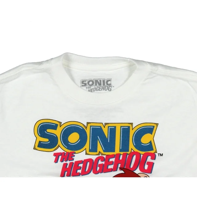 - This classic white tee showcases a vibrant front graphic print of Sonic alongside his closest allies – Tails, Knuckles, Amy Rose, and even his nemesis, Dr. Robotnik. The iconic Sonic the Hedgehog logo is prominently displayed above them, making this t-shirt instantly recognizable