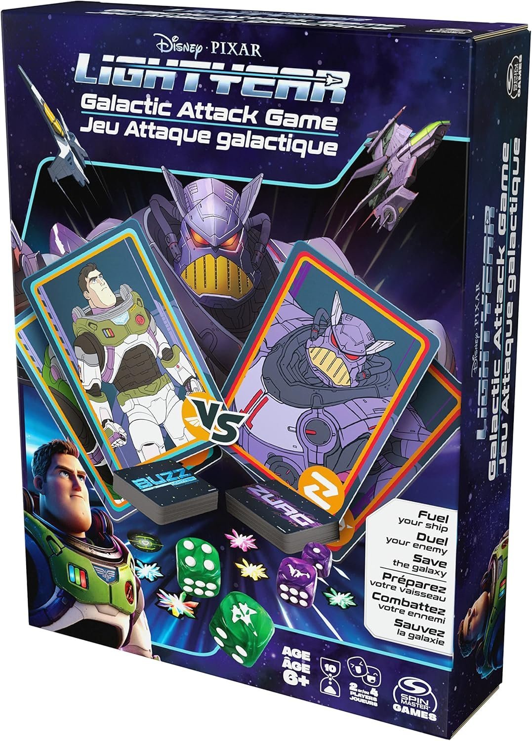 The new movie from Disney Pixar, Lightyear, is the sci-fi action-adventure that presents the definitive origin story of Buzz Lightyear. Based on the hero who inspired the toy—introducing the legendary Space Ranger who would win generations of fans. This card game from Spin Master Games will have your kids off the screens and playing alongside friends and family. The Galactic Attack card dice game can be played head-to-head or in teams of two. In this out-of-this-world card game, get ready to fuel your ship, duel your enemy, and save the galaxy. Commence countdown to the battle of all battles! It’s Buzz Lightyear vs Zurg in this epic card game where you’re on a quest to collect fuel cell crystals to achieve hyperspeed. This board game is for grown-ups and kids ages 6 and up. It only takes about 10 minutes to play, but you will definitely be wanting to play more than once! Both children and adults will love seeing Buzz Lightyear and the evil Emperor Zurg on this fun dice game. Scenes from Lightyear and fun graphics from the movie will have your kids more than excited to have a game night. This Disney toy is one of many Buzz Lightyear toys and games, and it will make the perfect present for any boy or girl who is obsessed with the movie. Stock up now for the holidays, birthdays, and more. Experience your new favorite movie based on Disney Pixar’s iconic Toy Story film with this action-packed card game.
