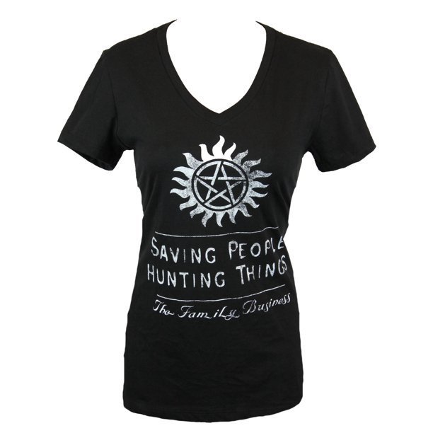 This black V-neck tee from Supernatural features the anti-possession symbol in white on the front with “Saving people, hunting things” and “The family business” underneath in different fonts.