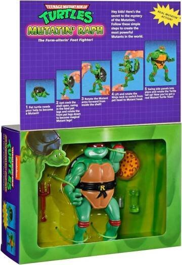 Now you can relive the amazing creation of Teenage Mutant Ninja Turtles. This turtle is ready to change. He’s tired of just being a pet turtle in a bowl; he wants to shake his little body and trade it for mutated muscles — and now you can do it! With only a few twists and shifts, this innocent turtle goes from easy prey to the blunt pizza-eating Ninja turtle, Raphael. Roles will be reversed for those who harass the helpless, weak, humble, and unmuted. And best of all, Raph can change again with your help! It’s true! Now, Raph has the perfect costume to sneak unexpectedly on Clan Foot. What will these turtles think next? Nobody knows that, except maybe Splinter. And remember, in every Mutatin turtle there is a hero waiting to get out! • Turn Ninja Turtle Raphael into a pet turtle in 5 easy steps! • Raphael is authentically decorated to match the original release of these characters in the 80s! • Raph’s accessories include Shape-changin’ Sais, Pizza Tossin’ Ninja Star, Retromutagen Ooze Canister and Pet Turtle Food Box. • COLLECT THEM ALL – Collect all TMNT Classic figures and accessories!