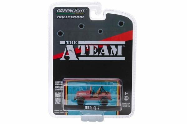 - 1/64 scale diecast car model of Jeep CJ-7 “The A-Team” (1983-1987) TV Series “Hollywood Special Edition” die cast model car by Greenlight.