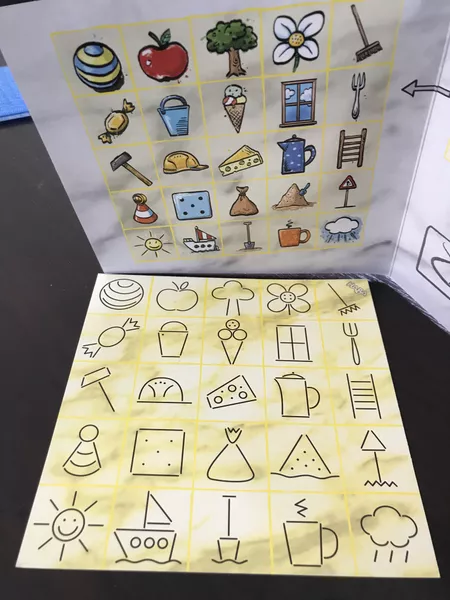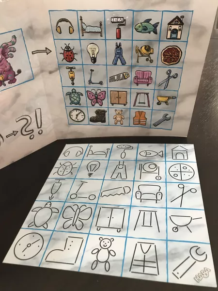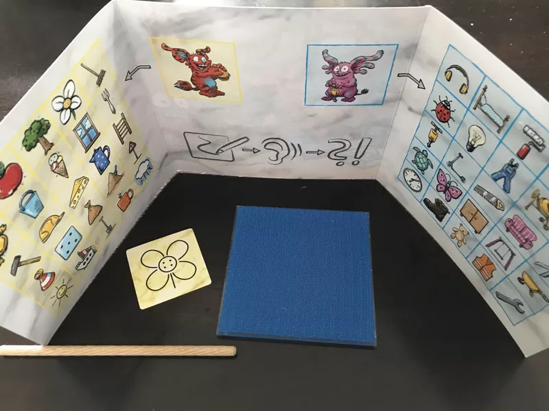 The supervisor takes the top task card and places it behind his screen so that only he can see it. The Hearmees focus their entire attention onto their venture cards! When everyone is ready, the supervisor takes the claw-it and copies the picture on the task card onto the clawky-talky.