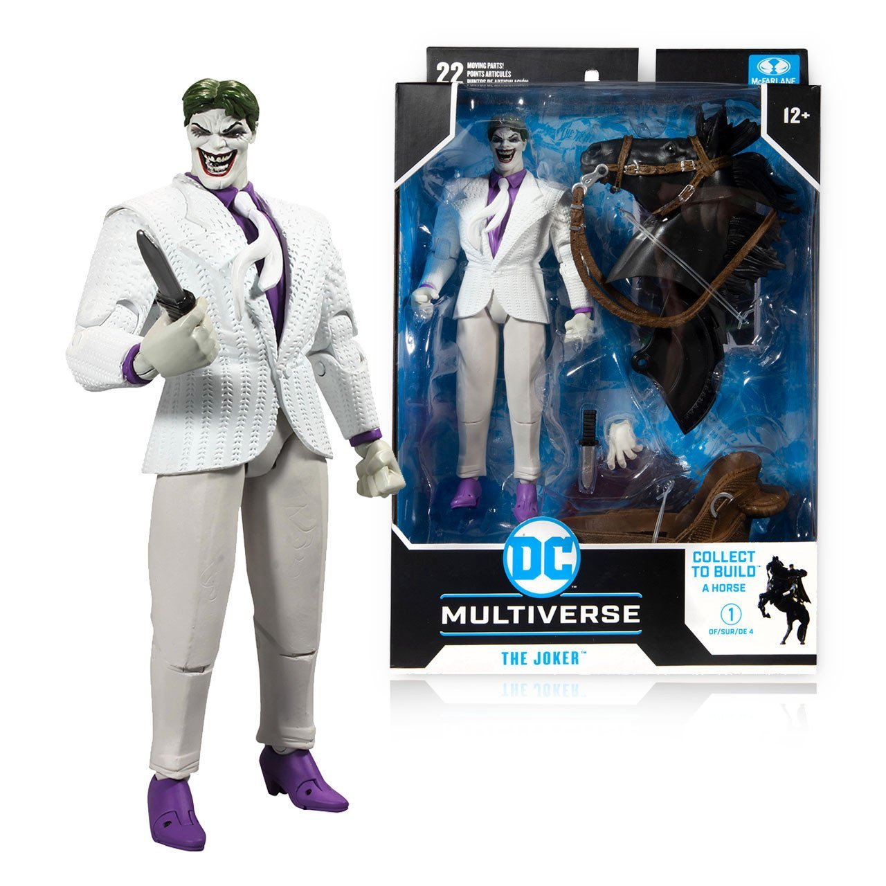 Once a small-time crook, The Joker fell into a vat of chemicals that turned his skin white, his hair green, and his lips red like a crazed clown. His crimes always involve pranks and jokes ending with twisted punchlines that are only funny to The Joker. He may look like he’s clowning around, but this guy is bad news for Batman and Gotham City! Now, upon hearing that Batman has resurfaced after 10 years of retirement, The Joker awakes from a years-long stupor in Arkham Asylum, conscious and ready to take on the Dark Knight once again! Incredibly detailed 7″ scale figure based off the DC Multiverse. Designed with Ultra Articulation with up to 22 moving parts for full range of posing and play. The Joker is based on his look from the DC Comic Dark Knight Returns. The Joker includes a knife, alternate hand, and a base. Figure includes 1 of 4 pieces that combine with The Dark Knight Returns Build-a line to assemble the Horse Batman rides into battle from the Dark Knight Returns. Included collectible art card with figure photography on the front, and character biography on the back. Collect all McFarlane Toys DC Multiverse Figures.