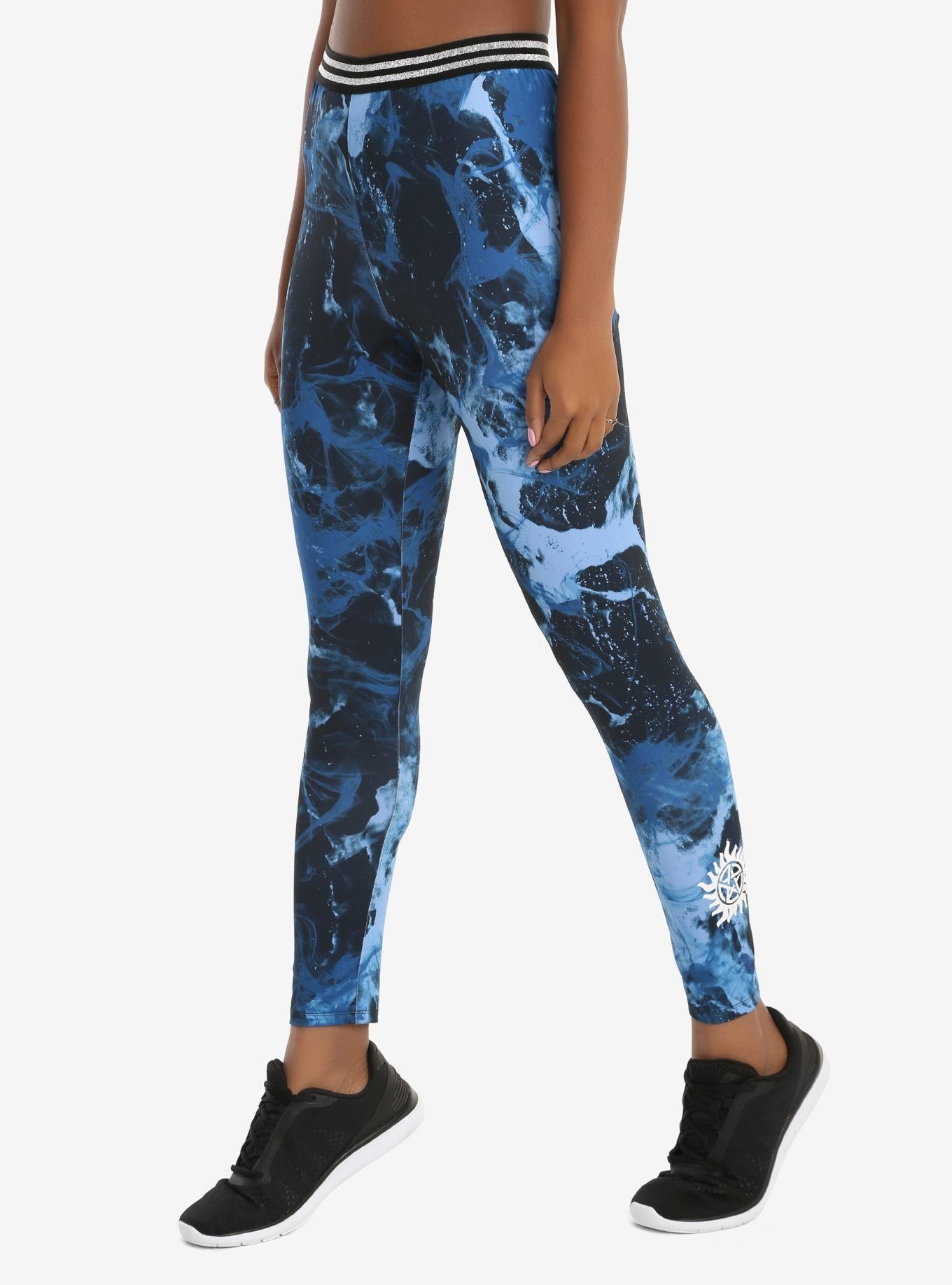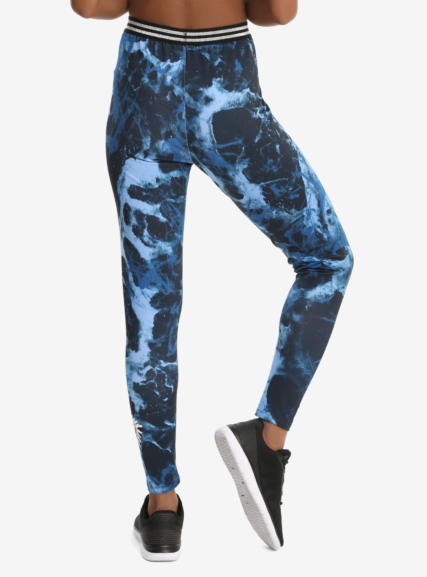 The blue marble print fitted pants have a silver and navy striped elastic waistband and an anti-possession symbol on the right ankle.86% polyester; 14% spandex